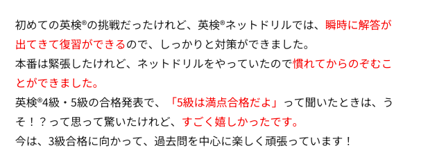 特に英検では「どれだけ問題に触れたか」が合否を分ける重要なポイントです。ネットドリルなら、紙教材のようにページ数に制限されることがなく、何度でも反復学習できるため、確実に実力を積み上げていけます。